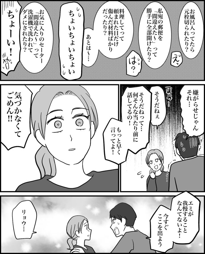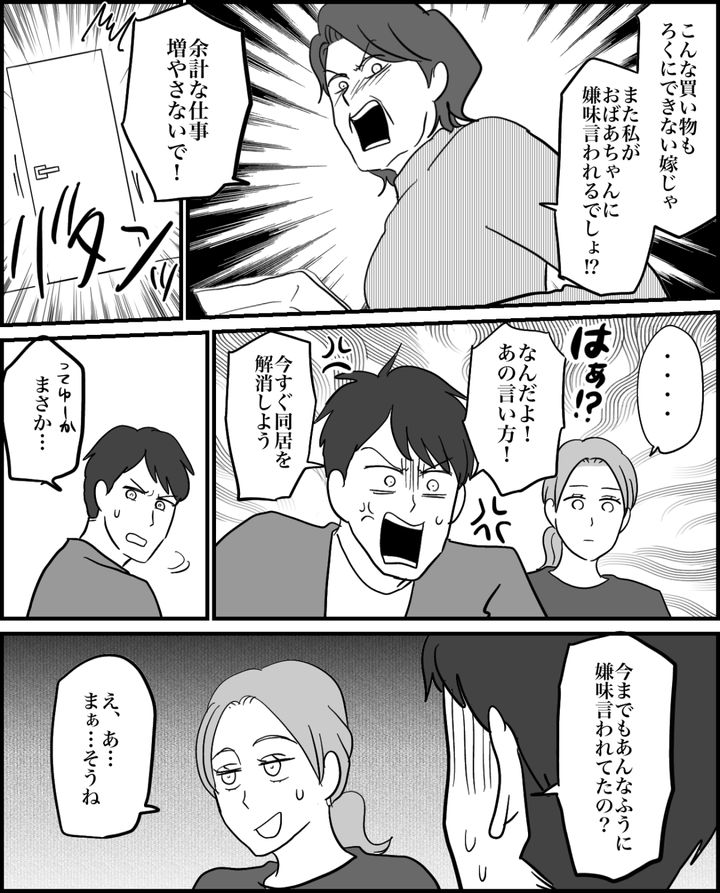 私はこれまで義母にされてきたことをリョウに話しました。「何そんな当たり前に話しているの! もっと早く言ってよ! 何も気づかなかった俺がバカみたいじゃん!」リョウはすぐにでも同居解消しそうな勢いです。しかし私は止めました。