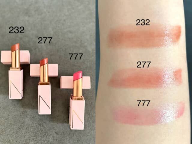 ▲NARS アフターグロー リップバーム N 全9色 各¥4,180(税込) / (左から)232 ラテブラウン、277 レッドチェスナッツ、777 ピーチピンク&ゴールデンシマー