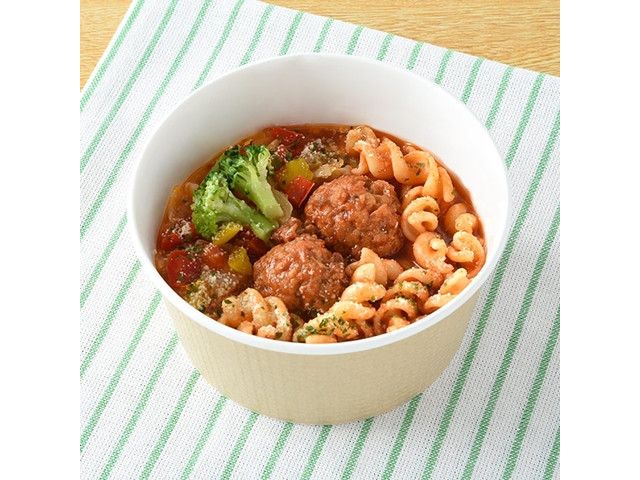 肉団子を使用した具材感のあるトマトスープです。トマトの酸味とうまみのきいたスープで、具材には肉団子・フジリ(パスタ)・玉ねぎ・キャベツなどを使用しています。 ※山梨県の一部、長野県では取り扱いございません。 関東・東海・北陸で販売