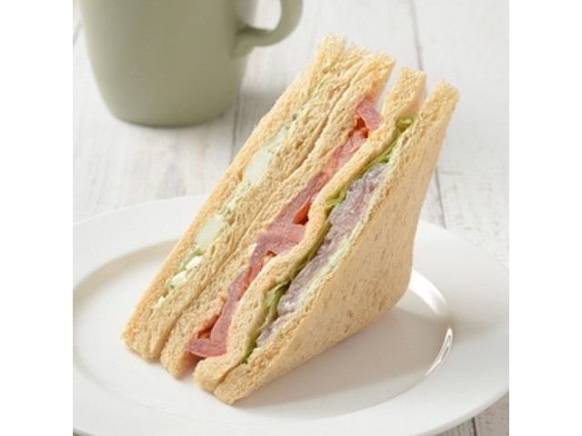 バジルの風味豊かな生ハムとトマトのサンド、バジルぺーストとダイスカットチーズを使用したポテトサラダサンドの2種が楽しめるサンドイッチです。