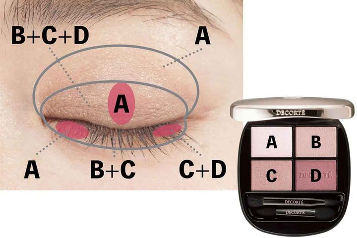 Aを二重幅&アイホール全体にスワイプ塗りし、B+Cを二重幅にのせて仕上げにDを。B+Cは下まぶたにものせて囲み目に。下まぶたの目頭はA、下まぶた目尻はC+Dでキュッと上げて。黒目上にAを。