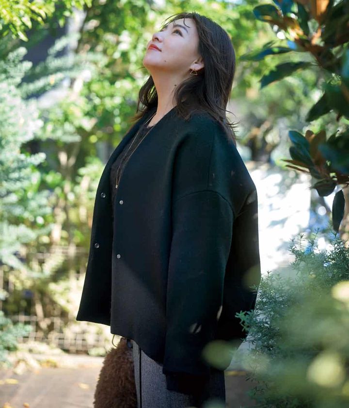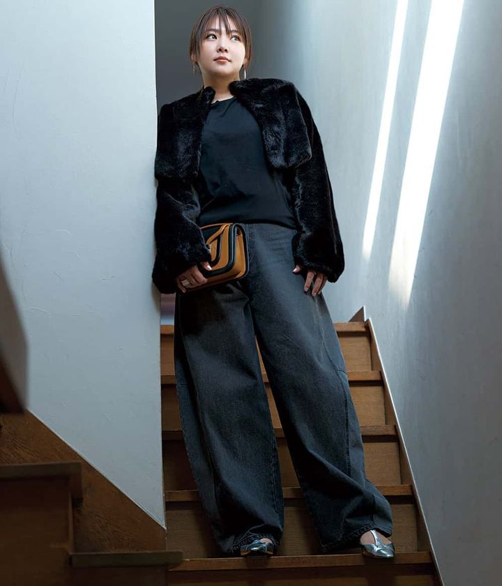 柔らかな丸みがあると、シルエット全体に女性らしさが宿ります。背中の丸みを包むアウターも、短か丈トップスに立体感のあるバレルのバランスも、その曲線をきれいに見せてくれる黄金比。丸みを活かすほど、ほぼクロがぐっと優しげに洒落て見えます。