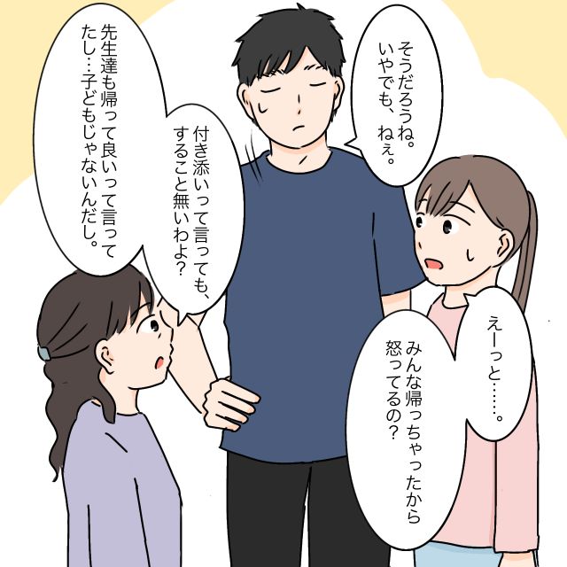 「えーっと、みんな帰っちゃったから怒ってるの?」私がそう聞くと、太郎は困ったような表情を浮かべて「そうだろうね・・・いやでも、ねぇ」と言葉を濁しました。すると義母が「付き添いって言ってもすることないわよ?先生たちも帰っていいって言ってたし、子どもじゃないんだから」と、ごもっともな意見を言いました。