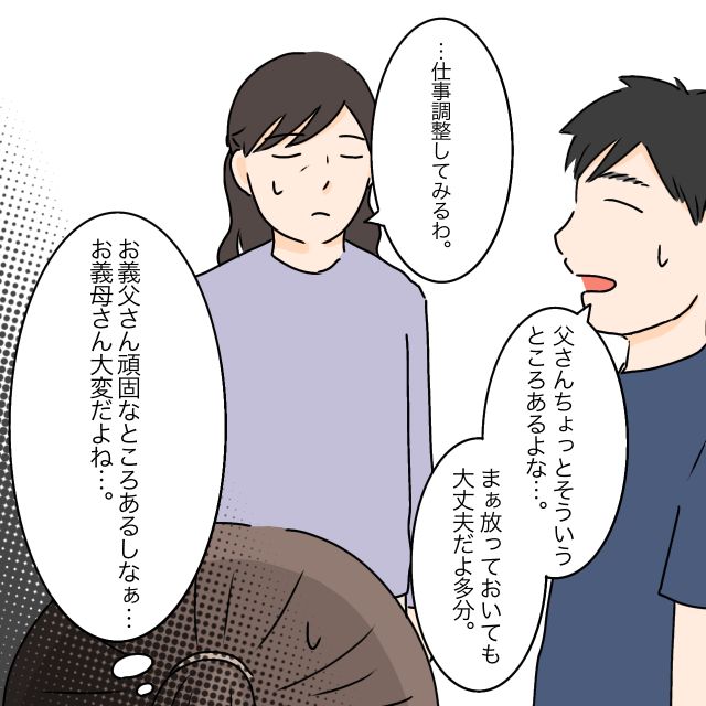 義祖母に手伝う気がないと分かると、義母は小さくため息をつき「・・・仕事調整してみるわ」とつぶやきました。太郎はそんな義母を気遣うように、「父さん、ちょっとそういうところあるよな・・・まぁ放っておいても大丈夫だよ多分」と声をかけます。義父は一度決めたらなかなか譲らない頑固な人。その性格を思うと、これから義母に降りかかるであろう苦労が目に浮かびました。