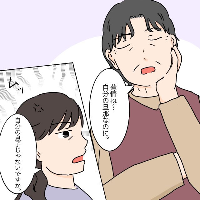 すると私たちの会話を聞いていた義祖母が「薄情ね~自分の旦那なのに」と義母に嫌味を言いました。義母はムッとして「自分の息子じゃないですか」と言い返します。