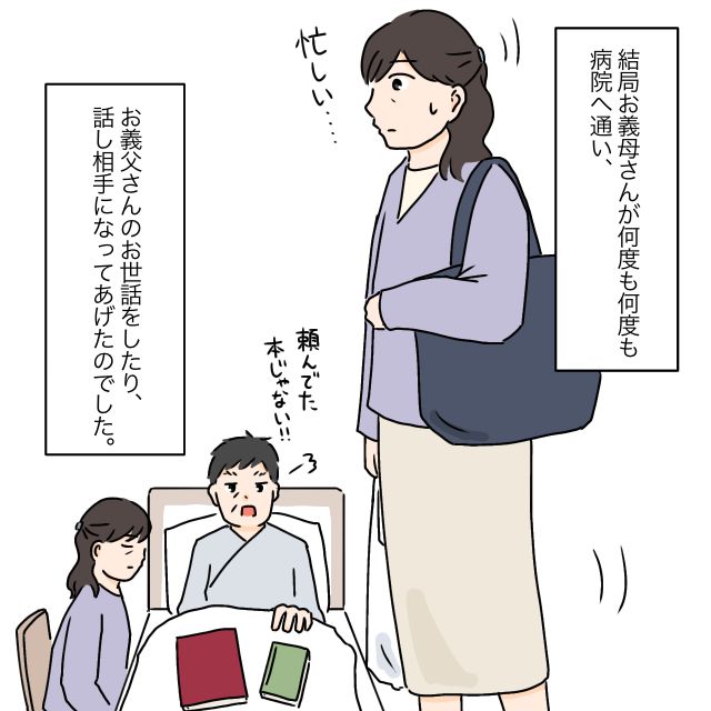 結局、義母は何度も病院へ足を運び、義父の身の回りのお世話をしたり、話し相手になったりしていました。仕事を調整しながら通院し、理不尽な要求にも文句ひとつ言わず応じる義母。その姿は明らかに無理をしているようで、私はただただ心配でした。