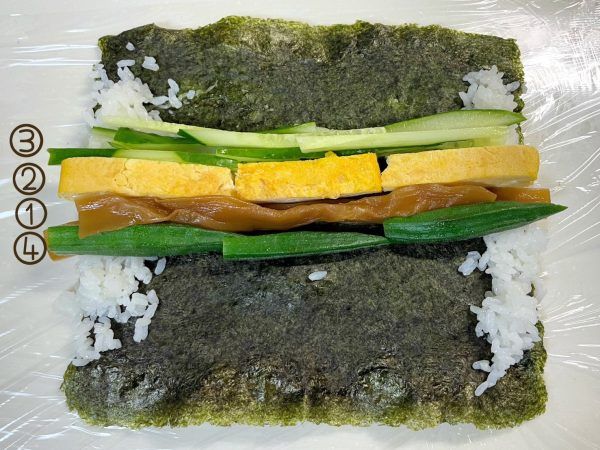 3)①干ぴょう②玉子焼き③きゅうり④オクラを順に乗せていきます。