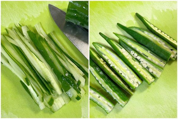 1)きゅうりは細切り、オクラは茹でて半分に、玉子焼きは出汁入りで焼いて細切りにしておきます。 ホタテは切り込みを入れて半分に開きます。