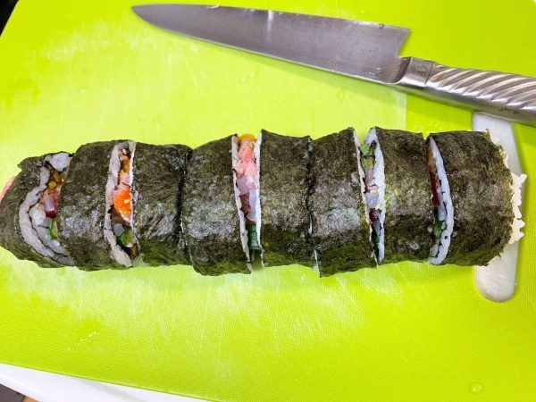 中身がいっぱい入ってるから、巻くのも切るのも難しかったけど、具だくさんの豪華な巻き寿司が完成したね。