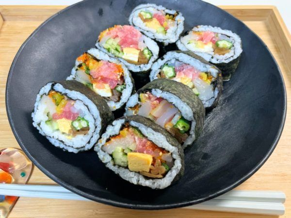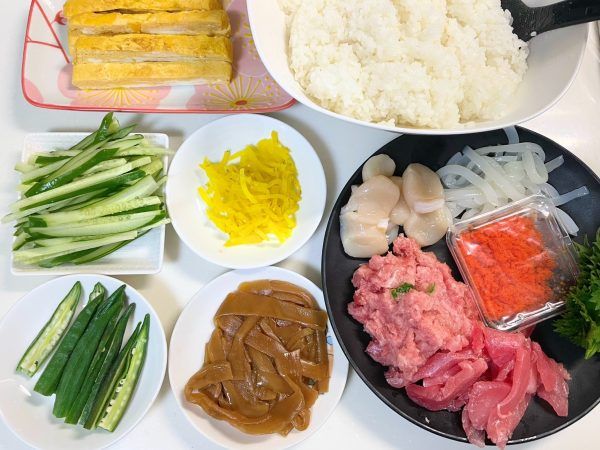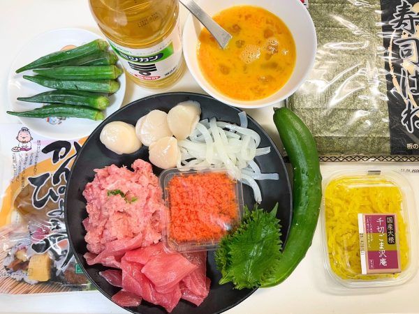 【材料】 ・酢飯:適量 ・海苔:2枚 ・干ぴょう:3本 ・玉子焼き:1本半 ・きゅうり:1/4本 ・オクラ:1本半 ・ホタテ:3枚 ・イカ:1本 ・マグロ:適量 ・ネギトロ:適量 ・たくあん:適量 ・大葉:1枚 ・とびっこ:適量 ・白ゴマ:少々