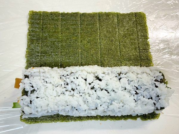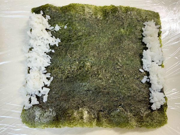2)あらかじめ酢飯を作っておきます。海苔に酢飯をまんべんなく広げたらひっくり返してください。 内側の両端にパンクしないよう酢飯で土手を作ります。