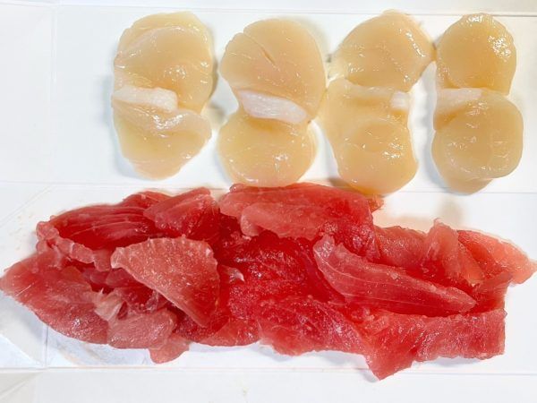 4)その上に海鮮類の⑤ホタテ⑥イカ⑦マグロ+ネギトロを乗せます。