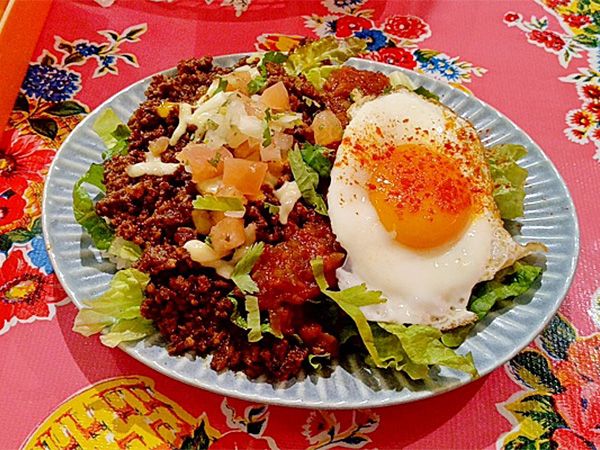 そして、タコライス!こちらもボリューム満点。ごはんとお肉とチーズとトロトロの黄身を絡めて食べると、たまりません。