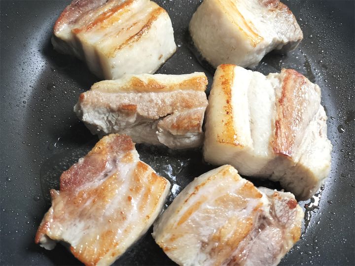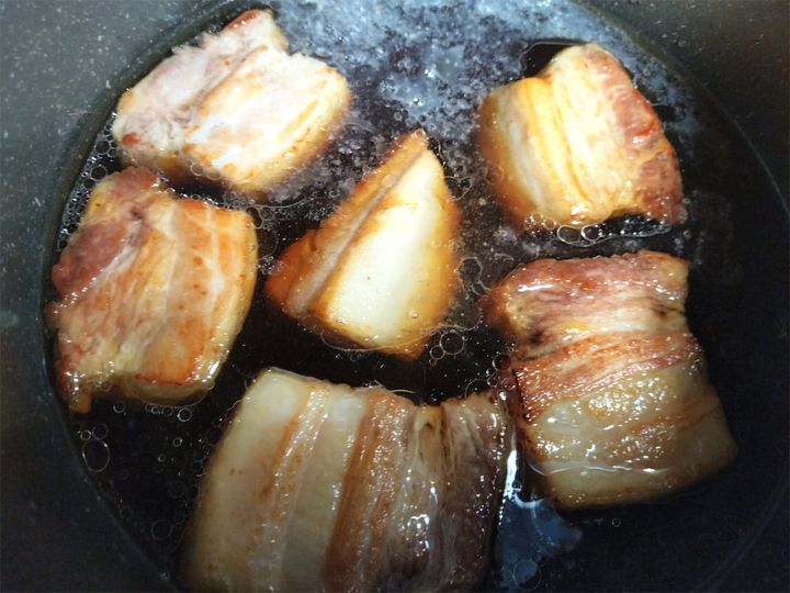 5. 鍋から豚肉を取り出し、水でアクを洗ってから、食べやすく一口大に切ります。