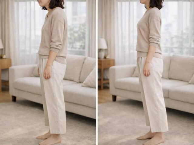 背中が丸まり、肩が前に入る姿勢になると、自然と骨盤も後ろに倒れやすくなります。するとお腹まわりの筋肉が使われにくくなり、下腹が前に突き出たようなシルエットに。実際の脂肪量が増えていなくても、ウエストラインがぼやけ、腰まわりに厚みが出たように見えてしまいます。さらにバスト位置も下がり、上半身全体が縦につぶれた印象になるため、「体重以上に太って見える」状態が完成してしまうのです。