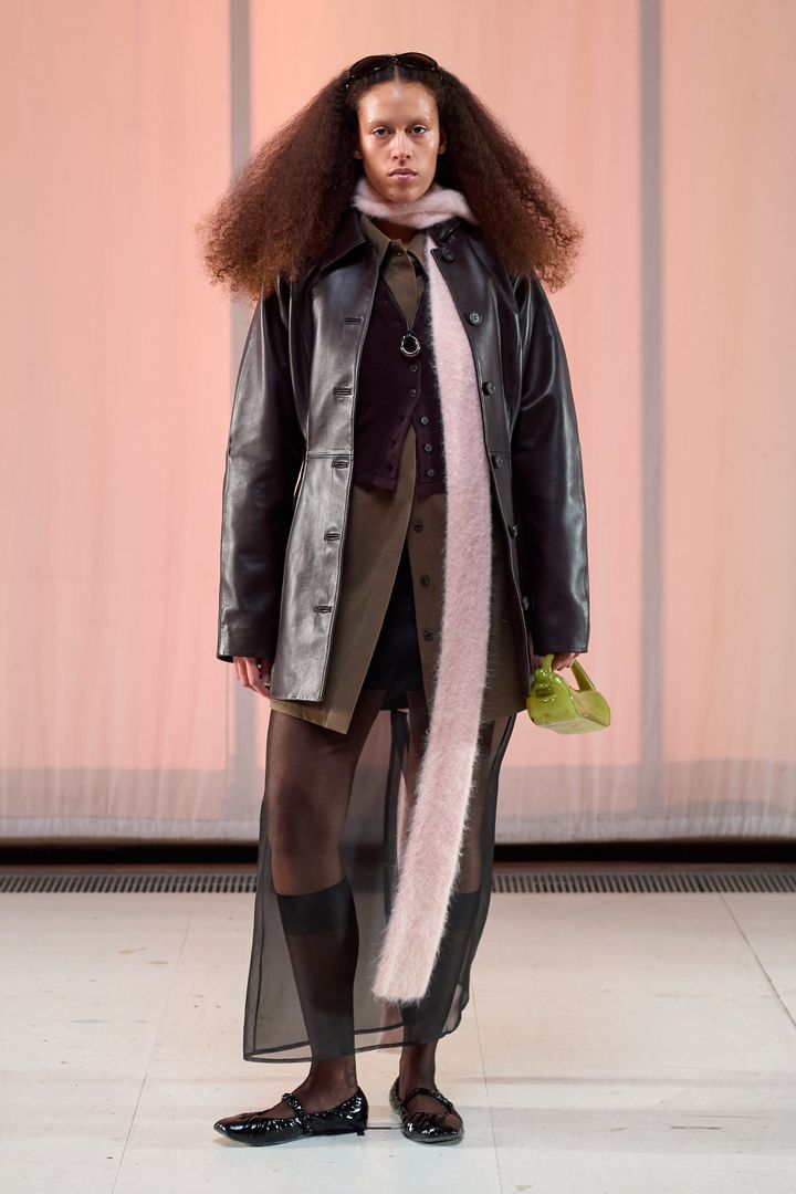 「ホルツワイラー」は、レザージャケット、シャツ、ベスト、シアースカートといった異なる素材を重ね合わせ、レイヤードスタイルをさらりとクールに表現。仕上げにピンクのふわふわスキニースカーフとグリーンのマイクロバッグを合わせることで、ブラウン一色になりがちな配色にアクセントを加え、フレッシュで若々しいムードをキープ。