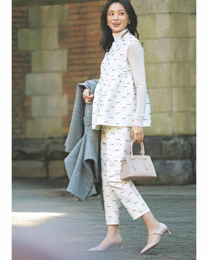 ジレ¥13,800ブラウス¥6,420(ともにミュー)パンツ¥15,950(DAY by DAY It,s international)バッグ¥22,900(チャールズ&キース/チャールズ&キース ジャパン)パンプス¥33,000(銀座かねまつ/銀座かねまつ6丁目本店)ピアス¥27,500〈ebiki〉リング¥18,700〈yuma〉(ともにロードス)ストッキング¥1,100(靴下屋/タビオ)