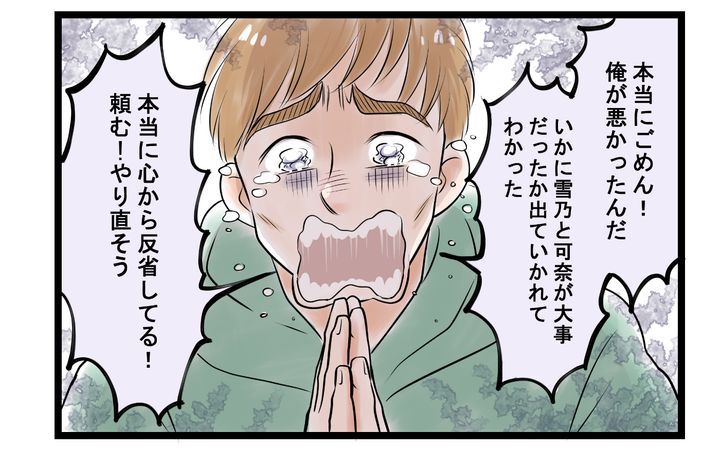 ひとりですさんだ生活を送る中で、いかに妻にラクさせてもらっていたか、そして、いかに人と一緒に暮らすことが幸せだったかを思い知りました。ようやく自分が悪かったと反省し、可奈の保育園に行って妻にやり直したいと謝りましたが、妻は全く聞く耳を持ってくれませんでした。