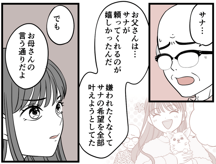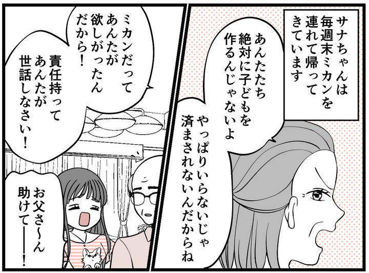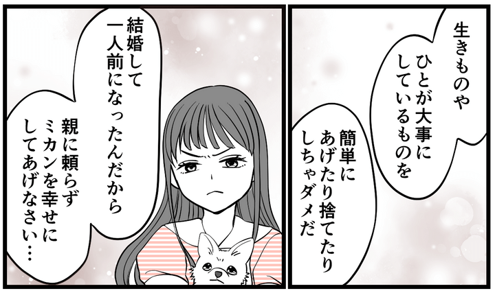 義父は「もう結婚して一人前になったんだから、親に頼らずミカンを幸せにしてあげなさい……」と、言いました。そして、今まで甘やかしてばかりだったことを反省し、自分には口を挟むことはできないと、はっきりとした態度で伝えたのです。