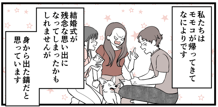 私はチグサ。夫の妹・サナちゃんとジュンセイさんの結婚式で、無事に私たち家族の愛犬モモコを取り戻すことができました。結婚式の慌ただしさにまぎれて、娘のユイカがモモコを保護。ジュンセイさんの姉・ミチルさんが予約してくれていたペットホテルにモモコを預けることができたのです。ジュンセイさんのお父さんは、参列者の前でモモコが私たちの犬であることを明言してくれました。
