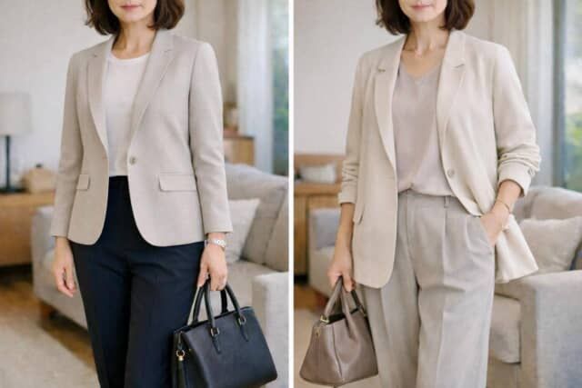テーラードジャケットにセンタープレスパンツ、インナーはシンプルなニットやカットソー。この組み合わせ自体は間違いではありませんが、シルエットや素材が昔のままだと、どうしても通勤感が強く出てしまいます。