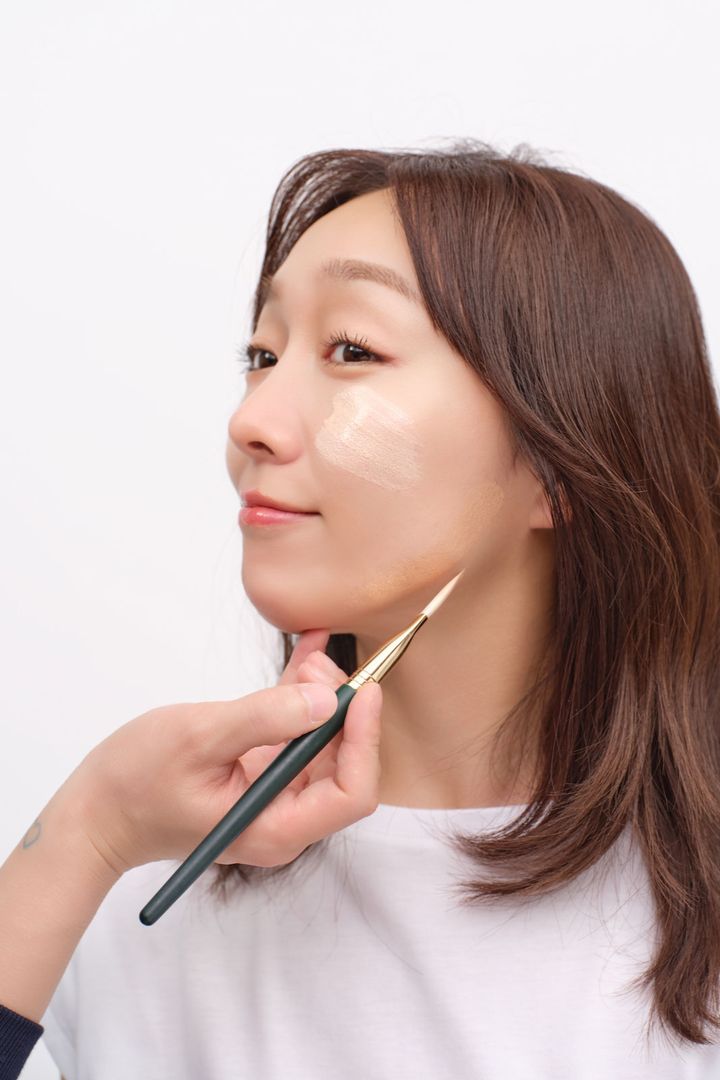 1. 明度の異なる2色のリキッドファンデーションを頬とフェイスラインにそれぞれのせ、スポンジで内側から外側に向かって伸ばしていく。境目が残らないように首までしっかり馴染ませる。