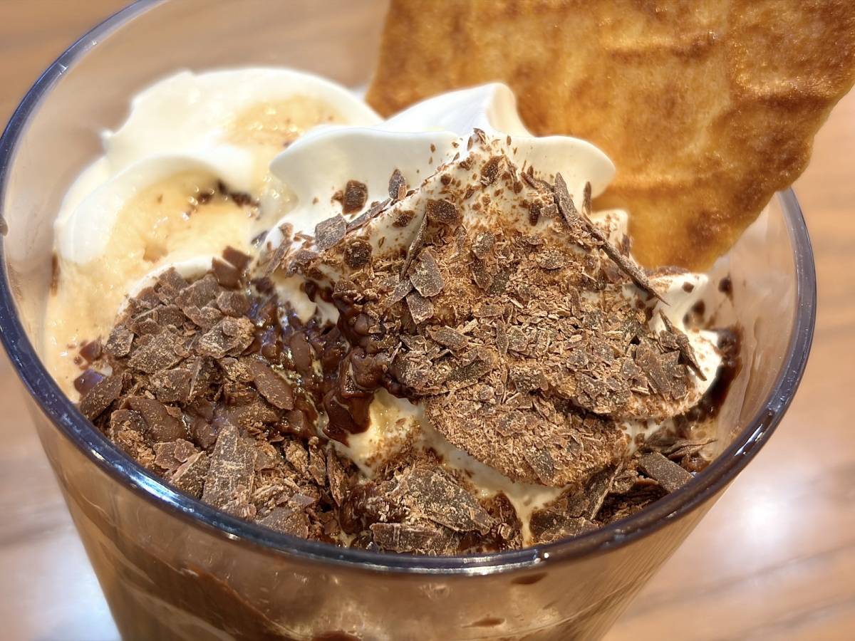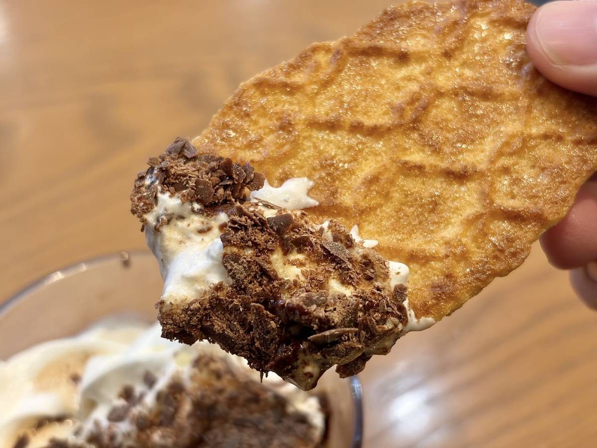 さっそく、別添えのワッフルクッキーをディップ。
