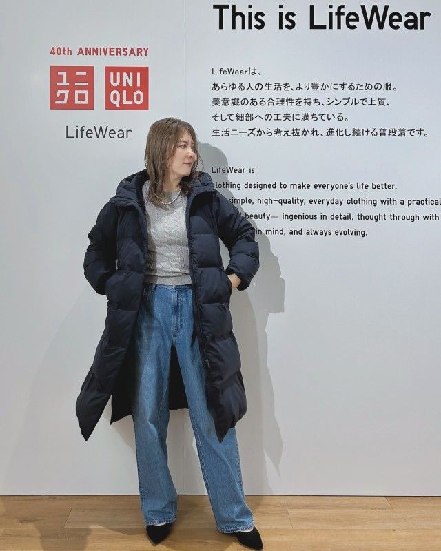 最後にご紹介するのは、ロングダウンとワイドデニムパンツの組み合わせ。「ロングダウンは着膨れ感が増しそう……」と思われがちですが、Iラインを意識すればスタイルアップが叶うんです。例えばスナップのようにフロントを開けて縦のラインを強調すると、ダウンもワイドデニムパンツもすっきり見えますよね♪