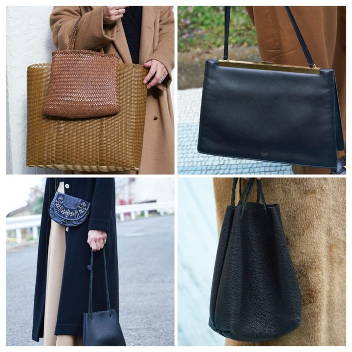 荷物が多い日は、大きめのかごバッグと小さいかごバッグを二つ持ちする清水さん。「かごは好きなアイテムで、冬にはレザーやリサイクルプラスチックにします」と清水さん。レザーバッグは、シューズに合わせて黒をそろえています。