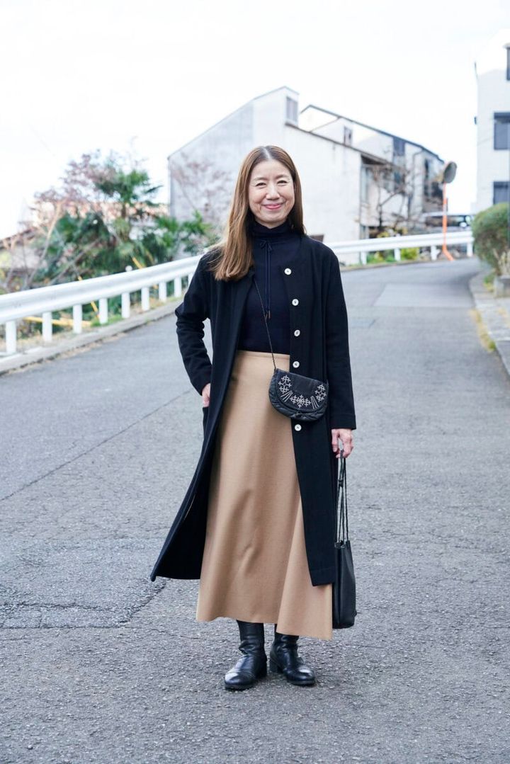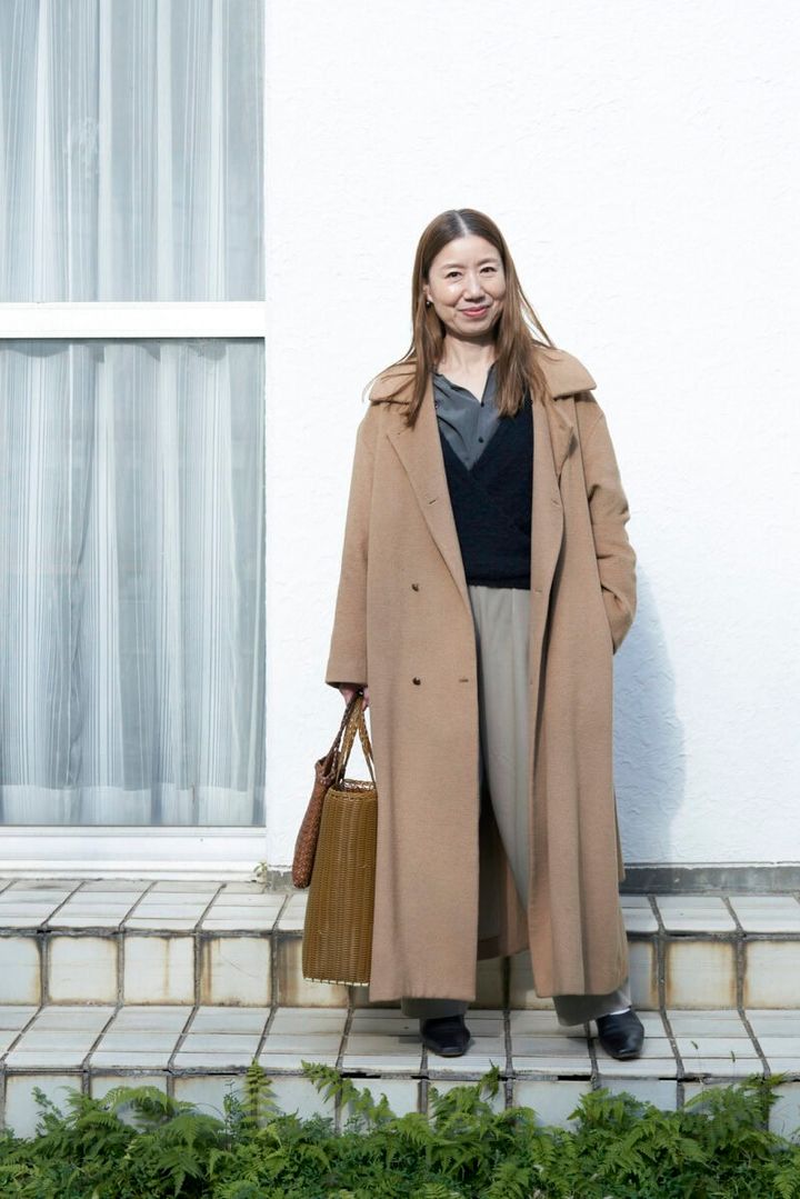 マキシ丈のコートはキャメル。「もう3シーズめになりますが、着心地がよくてとても気に入っています」と清水さん。腰まわりにゆとりがあるワイドパンツも、すっきりと女性らしいシルエットのテーパード。「友人のブランド『ユーモレスク』で、素材違いで毎シーズン登場する定番アイテム。同じ形を3本持っています」(清水さん)