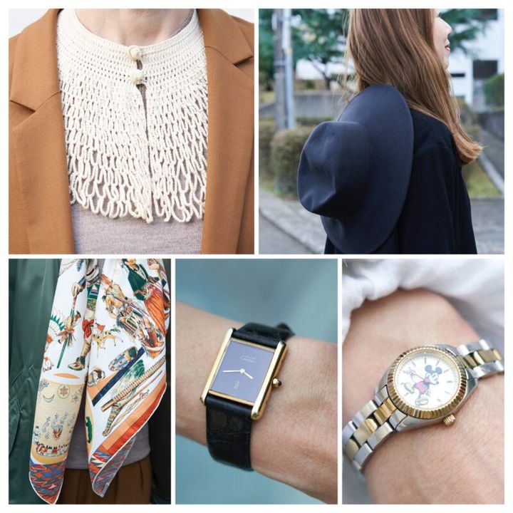 60年代のカルティエのタンクもあれば、気軽につけられるミッキーマウスの時計も。大人の遊び心を満たすアイテムがそろいます。ウールハットを背中にかけたり、マニッシュなジャケットにレースのつけ衿をオンするなど、清水さんのおしゃれをバージョンアップさせるアイテムはこちら。