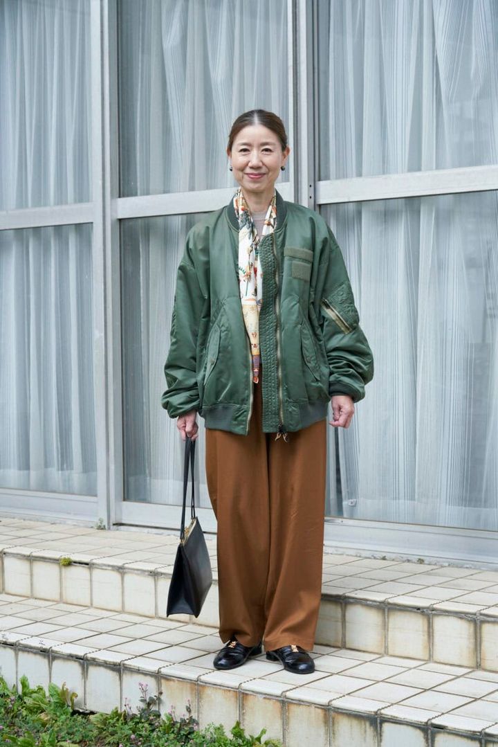 キャラメル色のタックパンツにカーキのMA-1をはおり、黒レザーローファーとセリーヌのバッグで品よくまとめました。エルメスのスカーフをまとってブルゾンからのぞかせるワザも◎