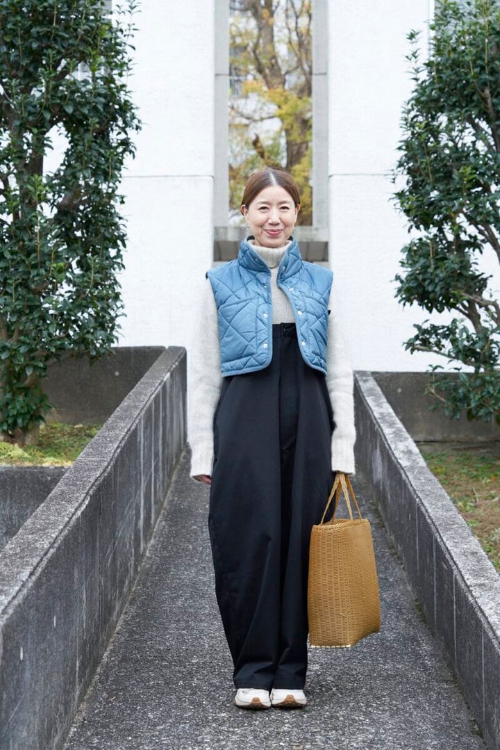 ユニフォームのようなデザインのサロペットパンツは、ピラティスや金継ぎの習いごとの日にぴったり。きれいなアイスブルーのミニ丈ダウンベストをはおると、目線が上がり上半身がコンパクトに。