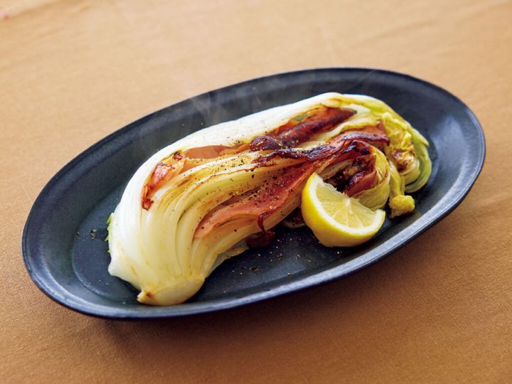 (2)フライパンにオリーブオイル大さじ1/2を中火で熱し、(1)の白菜を切り口を下にして入れ、4~5分焼く。焼きつける面を変えてふたをし、弱火で4分ほど蒸し焼きにする。器に盛り、塩、粗びき黒こしょう各少々をふり、レモンを添える。