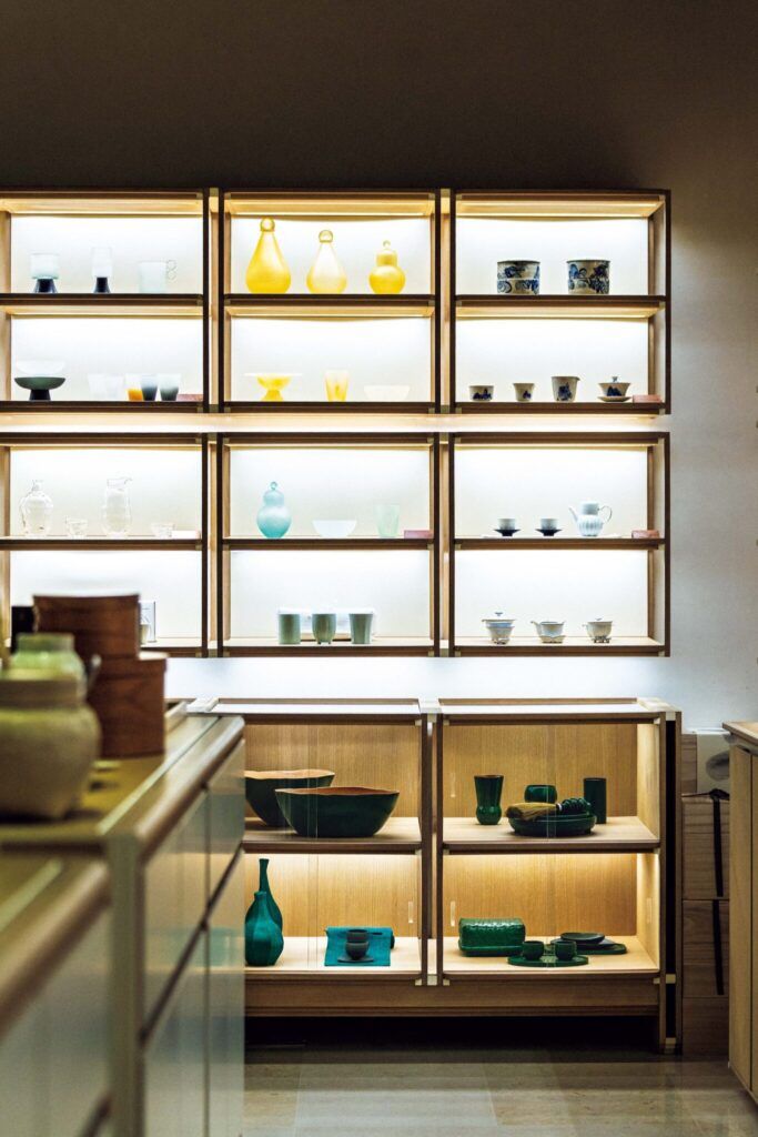 韓国の工芸ブランド〈multeo〉や〈verrevie〉のガラス、〈Studio FOH〉のカトラリー、キム・アラムの漆の盆が並ぶ。