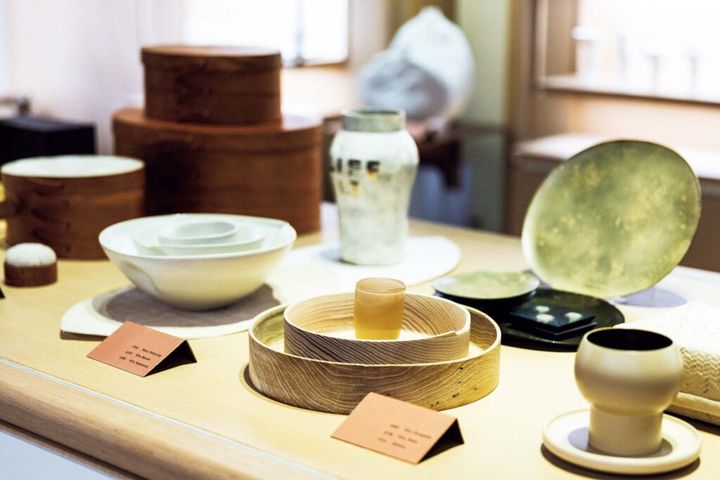 陶芸家のキム・へジョンの白磁やヨン・ホギョンの壺、木工作家キミヌの木製の盆など、韓国工芸界で注目を集める現代作家の作品が。