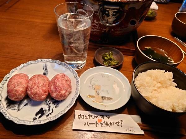 お昼のメニューから、炭火で食べる国産牛100%の粗びき赤身ハンバーグ。黒毛和牛 上赤身のガリバタ焼きを2人でシェアして食べることにしました。