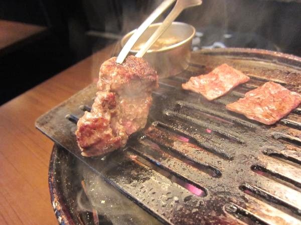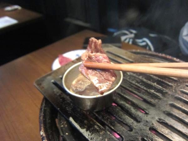 焼き方を教えてくれて、一つ目は、焼いてくれました。奥の器は、ガリバタ焼きのソースを温めています。お肉が焼けるいい香り~。目の前で焼くライブ感も楽しめます。
