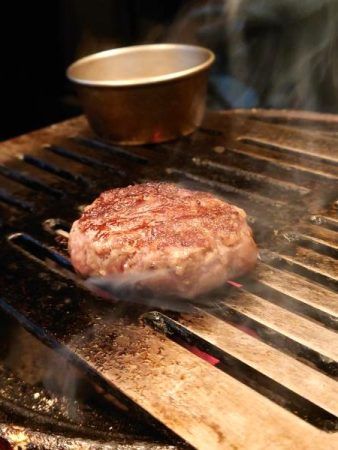 炭火で食べる国産牛100%の粗びき赤身ハンバーグ