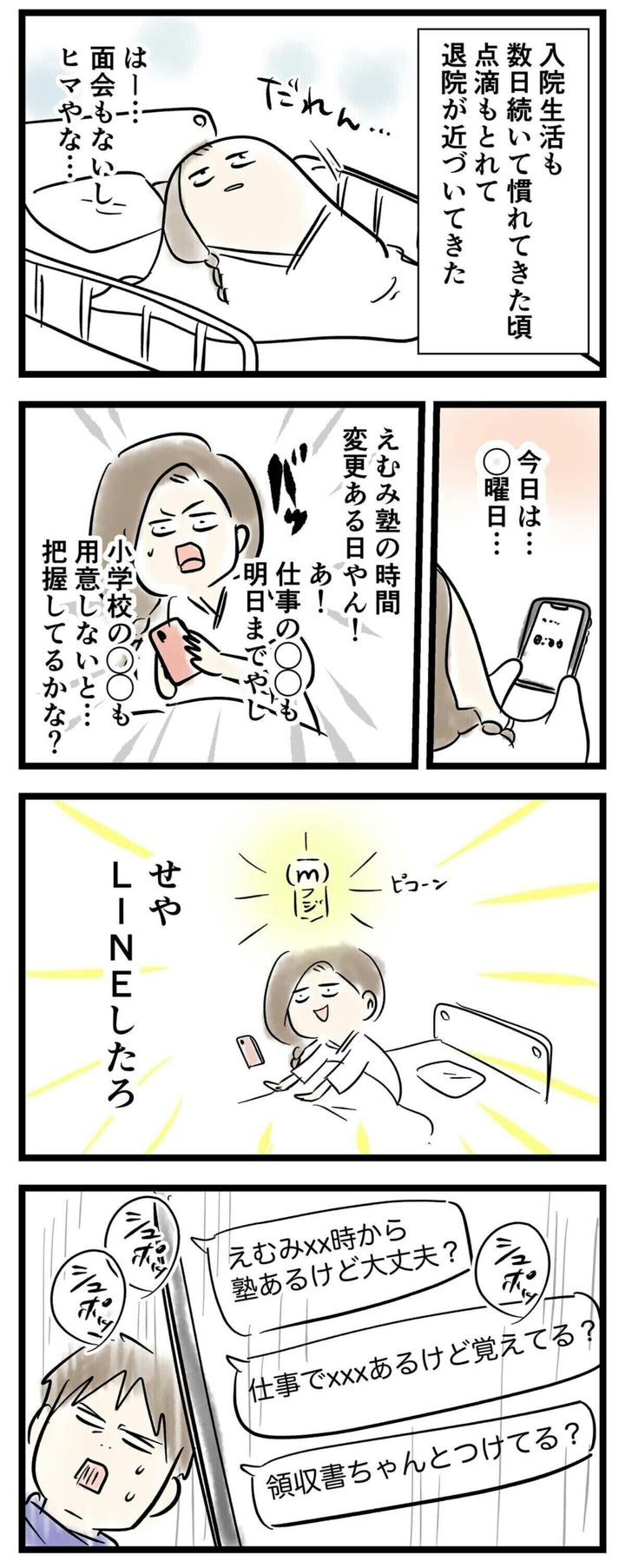 ふと子どもたちや仕事の予定を思い出し、いても立ってもいられなくなったえむふじんさんは、えむしさんに連絡してみることに。すると、予想に反して子どもたちは弁当作りや家事をこなし、勉強にもしっかりと取り組んでいたのでした。それを聞いて驚きとともに感動したえむふじんさん。思わず「盲腸になった甲斐があったわ…」と話します。