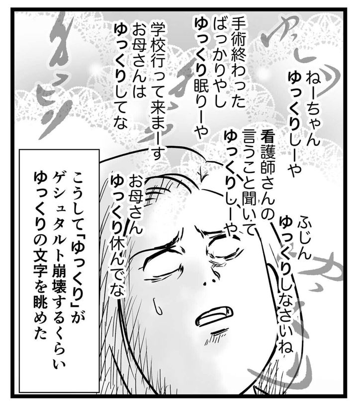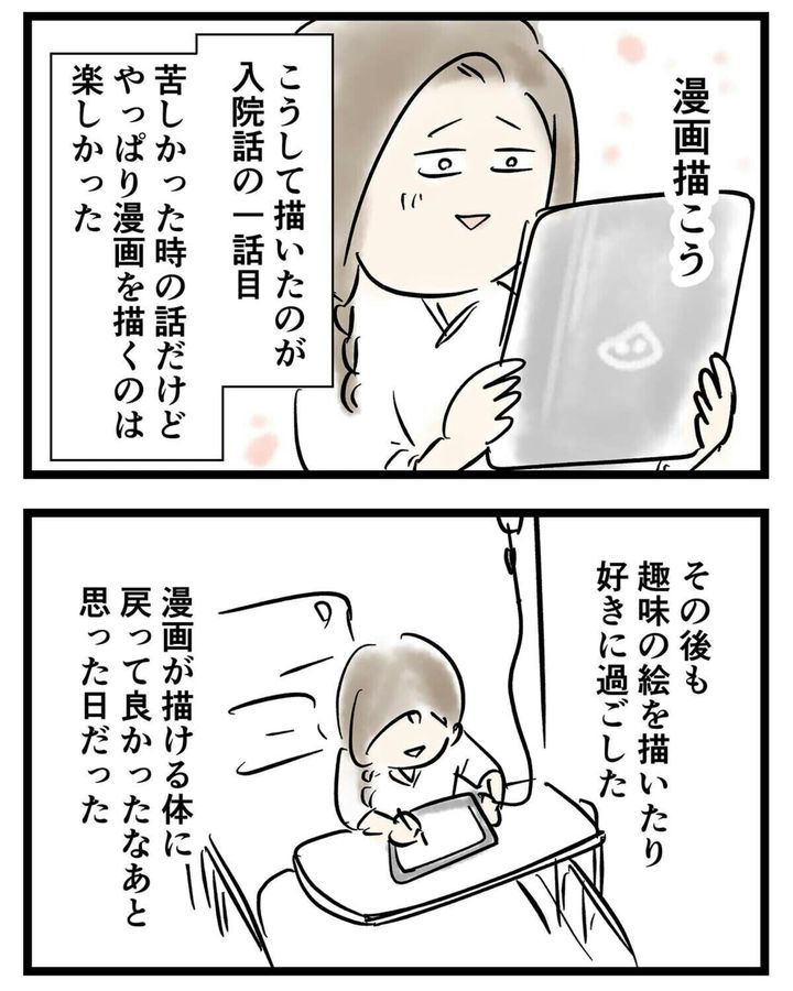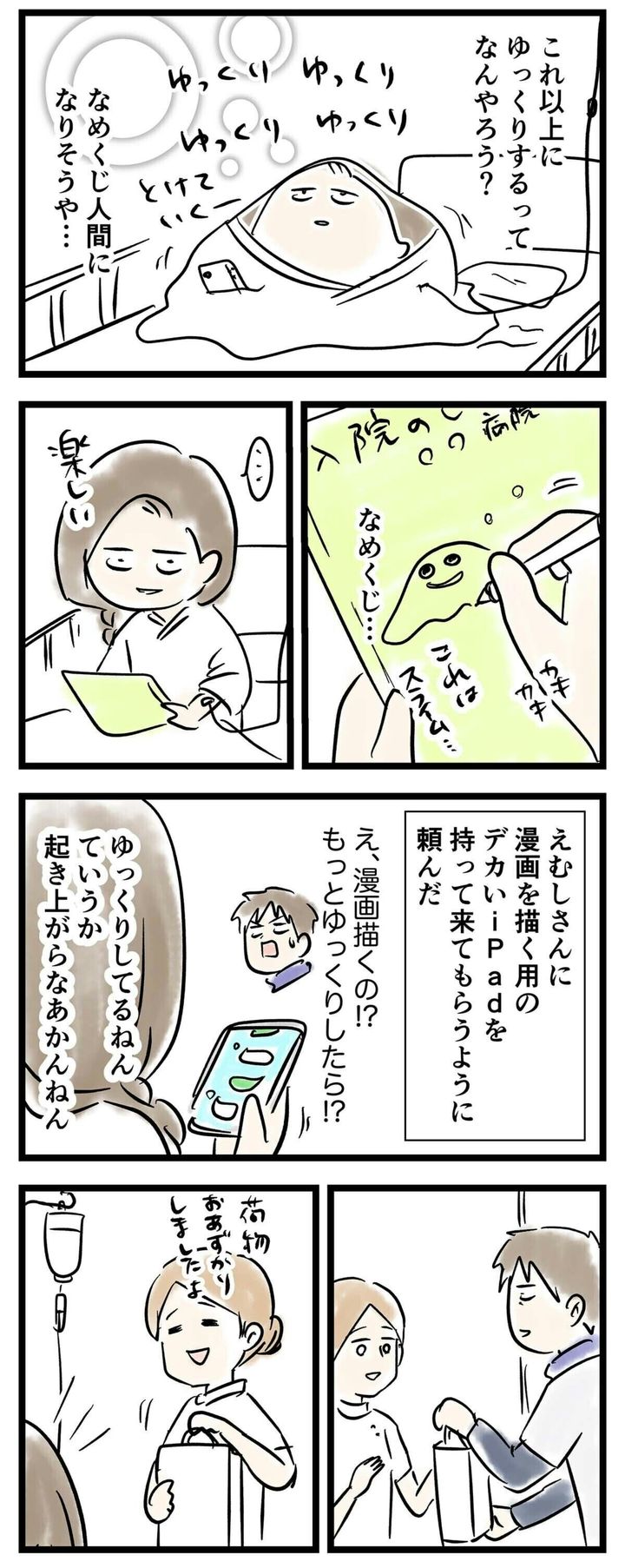 手術後2日目となり、医師からは動くようにと指示を受けたえむふじんさん。しかし、スマホに届いている家族や友人からのメッセージには「ゆっくり過ごしてね」という言葉が並んでいました。今ですらゆっくり過ごしているのにこれ以上どうすればいいのだろう…と考えたえむふじんさんは漫画や絵を描くことに。