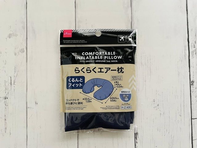 コンパクトで持ち運びやすい、ダイソーのエア枕「らくらくエアー枕」。やさしい肌ざわりと首にフィットする形状で、座ったままでもしっかり支えてくれます。