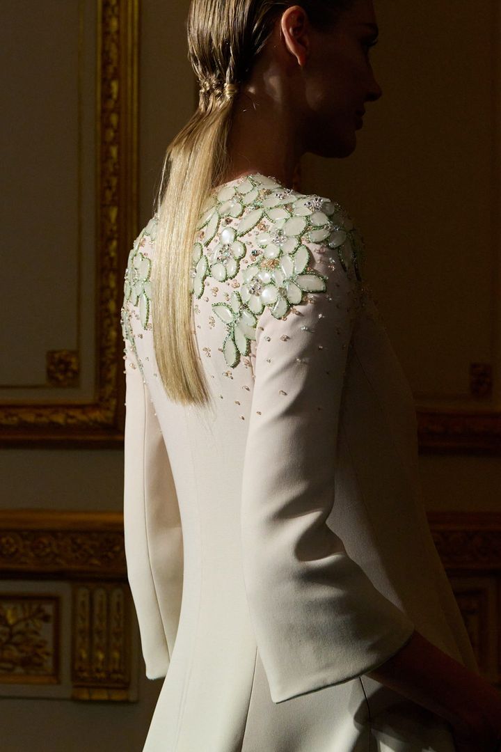 会場は、パリ・フランソワ一世通りに構えるアルマーニのクチュール本拠地。マーブルとフレスコ画に彩られた19世紀の館は、かつてジョルジオが最後のクチュールショーを行った場所でもある。哀悼の空気が漂いながらも、そこに集ったのはメゾンを長年支えてきた映画スターと顧客たち。彼女たちは皆、シルヴァーナによる最新ルックを身にまとっていた。
