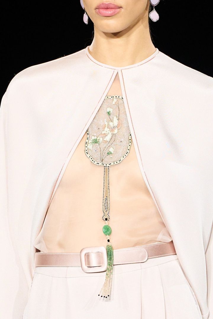 シルエットは紛れもなくアルマーニ。完璧なテーラリング、構築的なショルダー、端正なブレザーとボレロ、ジャカードのスモーキング。しかしそこには、これまでになかった軽やかな官能性が差し込まれている。サイドにスリットを入れたシャツ、透け感のあるブラウス、ウエストに沿って輝くコラムドレス、そして時折のぞくランジェリー。