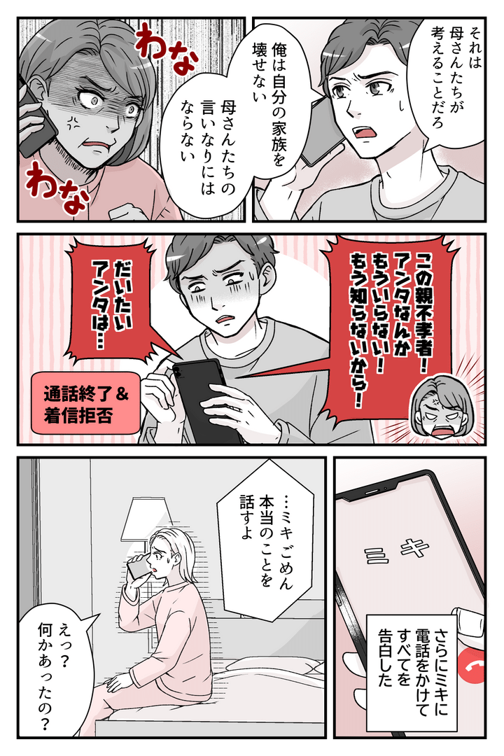 母はまだ何か騒いでいましたが、俺は電話を切りました。そしてそのまま母を着信拒否しました。さらにミキに電話をかけて、すべてを告白しました。