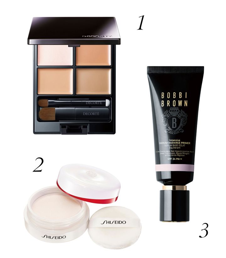 1 ツヤをまといながらシミやクマなどの肌悩みを自然にカバー。トーンパーフェクティング パレット 01 ¥5,170/コスメデコルテ 2 毛穴をぼかしながらワントーン明るい肌に。インテンシブ セラム ラディアンス プライマーSPF24(PA++) ロージー 40㎖ ¥7,370/ボビイ ブラウン 3 空気のように軽い“美容液パウダー”。透明感のある仕上がりが完成。エッセンス スキンセッティング パウダー 02 ¥5,500/SHISEIDO