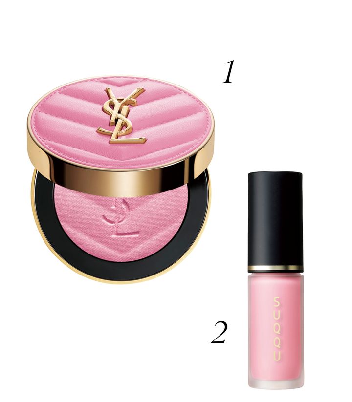 1 コットンキャンディーのように甘くきらめくシュガリーピンク。YSL メイクミーブラッシュ パウダー 10 ¥8,360/イヴ・サンローラン・ボーテ 2 顔色を美しく仕立てるリキッドチーク。ノンパールのコットンピンクで多幸感を演出して。コンプレクション フェイス カラー 02 ¥4,950/スック