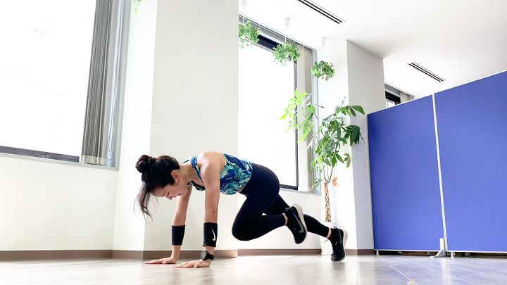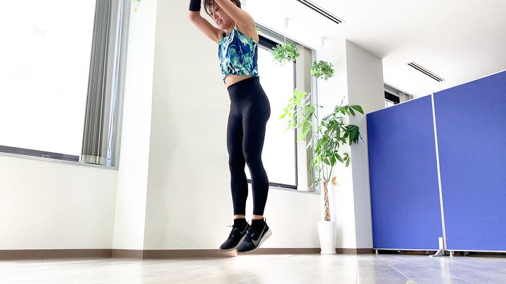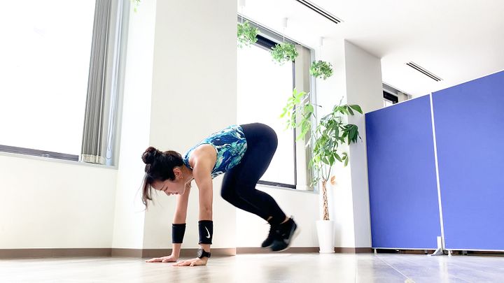 1.軽くジャンプしてからしゃがみ、両足を後ろへ伸ばす