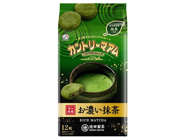 ・甘みと渋みの調和のとれた、濃厚でコクのある鹿児島県産抹茶を生地に練り込み、チョコチップを合わせて焼き上げたカントリーマアム ・抹茶のほどよい苦味と奥深い味わいが愉しめる期間限定商品 ・茶師十段池田研太氏監修 ・創業78年の老舗茶商「池田製茶」の抹茶を使用