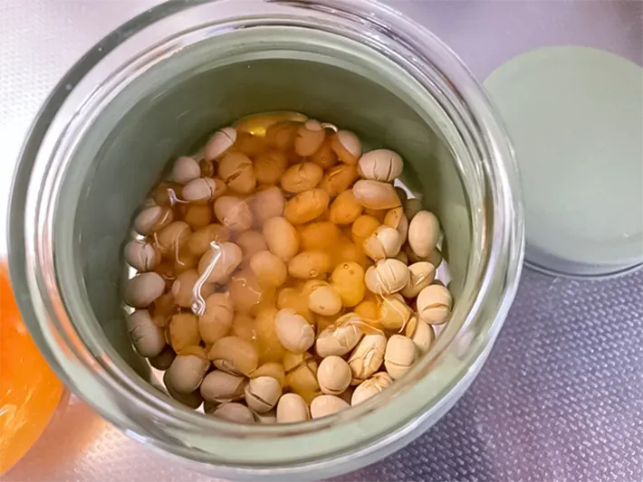 ハチミツはあまり粘りのない物を使用すると、大豆にしみ込んで大豆がやわらかくなりますが、粘りのあるハチミツにつけると3日以上経ってもカリカリ大豆のまま。